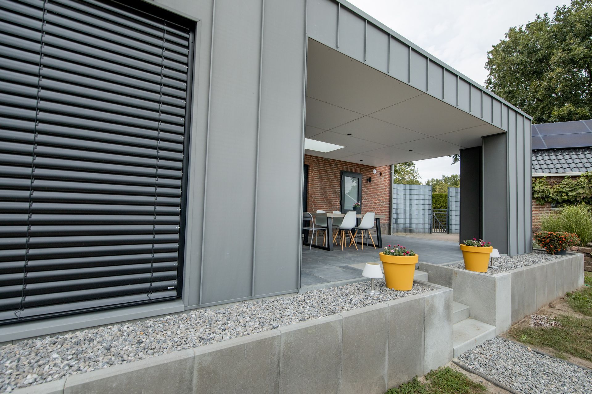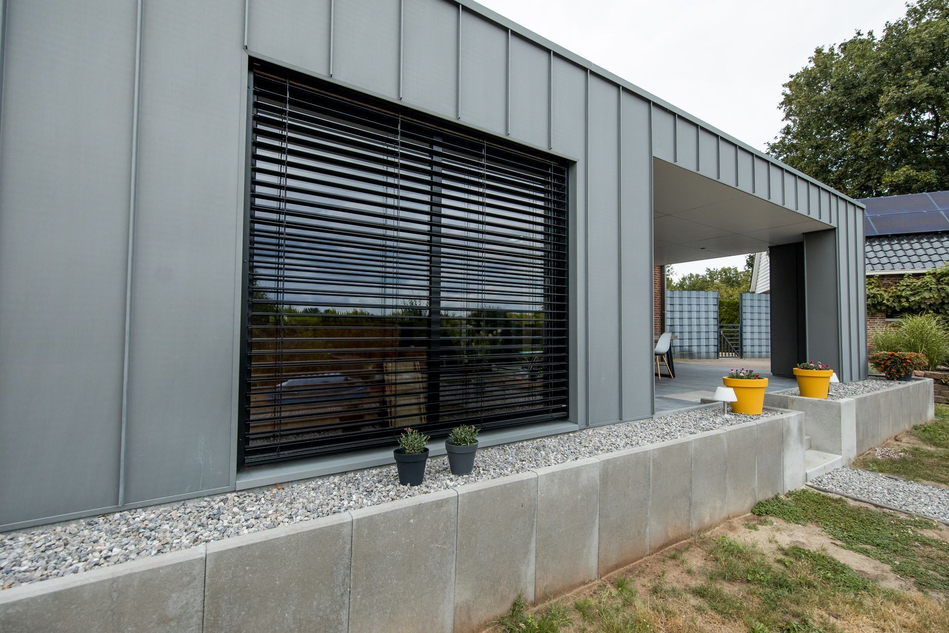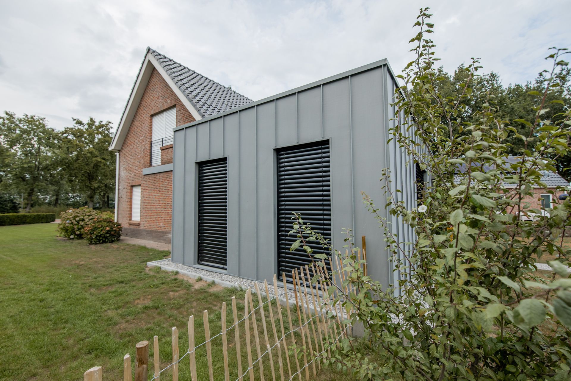 Interne verbouwing met aanbouw afgewerkt met zinken gevelbekleding.